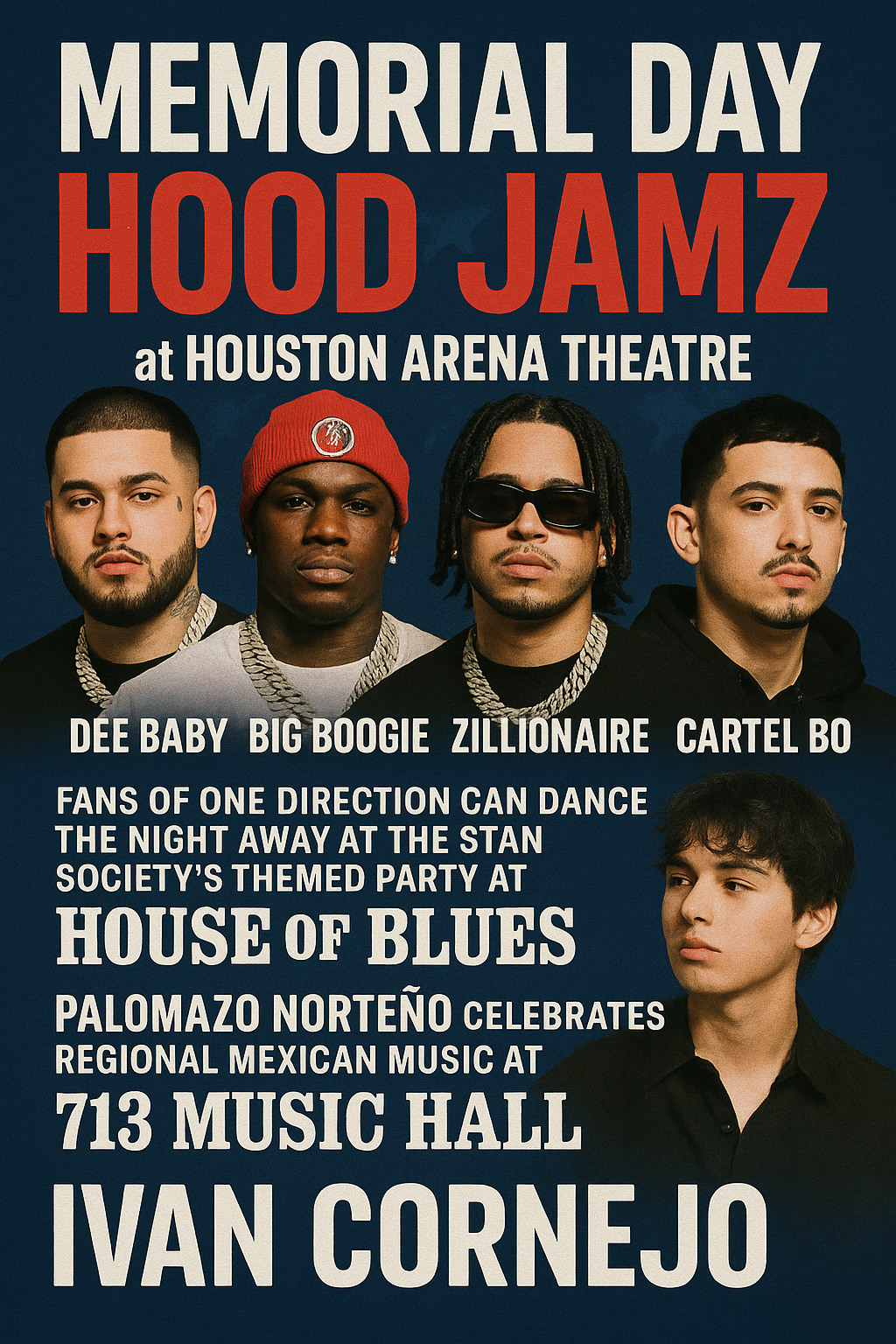 The night continues with high-energy events: Memorial Day Hood Jamz at Houston Arena Theatre features performances by Dee Baby, Big Boogie, Zillionaire, and Cartel Bo. Fans of One Direction can dance the night away at the Stan Society's themed party at House of Blues. Palomazo Norteno celebrates regional Mexican music at 713 Music Hall, and Ivan Cornejo captivates audiences at NRG Arena with his "Mirada Tour." EDM enthusiasts can experience the bass-heavy sounds of Rusko and SubDocta at 9PM Music Venue, while Broadway fans can sing along at the Broadway Rave at White Oak Music Hall. The evening wraps up with a nostalgic tribute to Fall Out Boy by "Take This To Our Grave" at Scout Bar.
